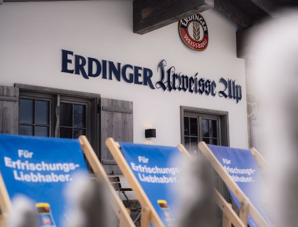 Mit einer großzügigen Sonnenterrasse und einem stilvoll eingerichteten Innenbereich lädt die Erdinger Urweisse Alp zum Geniessen ein. Freuen Sie sich auf freundlichen Tischservice und regionale Spezialitäten von Küchenchef Andi Hindelang.